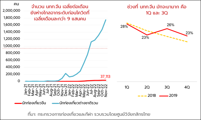 • ภาพการเพิ่มขึ้นของนักท่องเที่ยวจีนเที่ยวไทย หากเร่งตัวขึ้นได้ไม่ทันในไตรมาสแรกของปีที่มีวันหยุดเทศกาลตรุษจีน ซึ่งในปี 2566 ตรงกับเดือนมกราคม (ก่อนโควิด ไตรมาสแรกปี 2562 มีชาวจีนเดินทางเข้าไทยราว 28% ของทั้งปี) ก็อาจจะเห็นการเร่งตัวขึ้นในช่วงไตรมาสที่สามซึ่งเป็นช่วงปิดภาคการศึกษาและต่อเนื่องกับวันหยุดเนื่องในวันชาติจีนในต้นไตรมาสสุดท้าย (ก่อนโควิด ไตรมาสที่ 3 ปี 2562 มีชาวจีนเดินทางมาไทยราว 26% ของทั้งปี)
