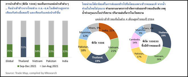 สำหรับข้าวเกรดคุณภาพ (พิกัด 100630 ซึ่งมีข้าวหอมมะลิรวมอยู่ด้วย) ที่ผ่านมาจีนนำเข้าจากไทยในปริมาณที่มากกว่าแหล่งนำเข้าอื่นๆ รวมถึงเวียดนามด้วย ดังนั้น ศูนย์วิจัยกสิกรไทย มองว่า ข้าวหอมมะลิไทยน่าจะได้รับผลบวกในการส่งออกไปจีน ซึ่งตรงกับช่วงที่จะมีผลผลิตออกสู่ตลาด โดยความต้องการจากจีน ประกอบกับการที่ไทยกับเวียดนามกำลังเตรียมหารือร่วมกันในการดูแลราคาข้าวในตลาดโลก จะช่วยหนุนราคาข้าวหอมมะลิและข้าวในภาพรวมให้มีแนวโน้มยืนระดับสูงได้อย่างต่อเนื่อง