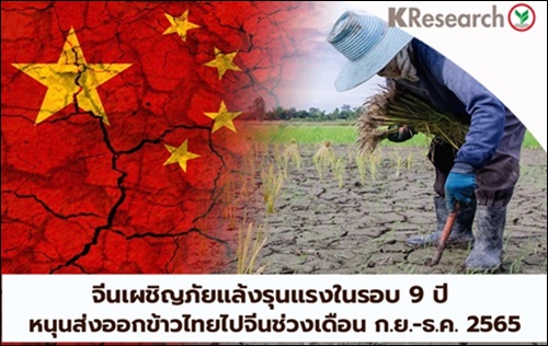 จีนน่าจะนำเข้าข้าวจากไทยเป็นหลักในช่วงที่เหลือของปี 2565 เพื่อชดเชยผลผลิตข้าวที่เสียหายของจีน ในจังหวะที่ข้าวนาปีของไทยกำลังออกสู่ตลาดโดยเฉพาะข้าวหอมมะลิ ขณะที่แหล่งนำเข้าข้าวอื่น อาทิ เวียดนาม ปากีสถาน รวมถึงอินเดีย น่าจะมีข้อจำกัดด้านผลผลิตและมาตรการจำกัดการส่งออก แต่ต้องจับตาสถานการณ์น้ำท่วมในไทยและเศรษฐกิจจีนที่ยังมีความไม่แน่นอนสูง ซึ่งอาจทำให้การส่งออกข้าวไทยไม่ได้ผลบวกอย่างเต็มที่ โดยหากพิจารณาในรายการพืชเกษตรที่เสียหายและจีนอาจมีการนำเข้าเพิ่มขึ้น ซึ่งเป็นพืชที่ตรงกับฤดูกาลของไทยที่สามารถให้ผลผลิตและส่งออกได้คงเป็นข้าว เป็นสำคัญ