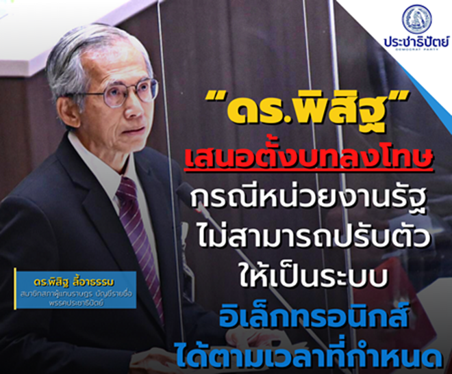 พร้อมกับยกตัวอย่างว่า ในปี 2561 รัฐบาลได้กำหนดให้หน่วยงานของรัฐไม่ถ่ายสำเนาบัตรประจำตัวประชาชน แต่ผ่านไป 3 ปี เมื่อไปติดต่อหน่วยงานราชการก็ยังคงเรียกขอสำเนาบัตรประจำตัวประชาชนอยู่ จนกระทั่งเดือนกันยายนที่ผ่านมา มีประกาศของกรมการปกครองห้ามไม่ให้มีการเรียกสำเนาบัตร และเพิ่งมีการประกาศลงในราชกิจจานุเบกษาไปไม่นาน ในเรื่องนี้ ดร.พิสิฐ ยังมีความเป็นห่วงว่า แม้จะมีประกาศดังกล่าวไปแล้ว แต่หน่วยงานก็ยังไม่ปฏิบัติ ดังนั้น ตนและเพื่อน ส.ส. พรรคประชาธิปัตย์ จึงได้นำเสนอกฎหมายเพื่อให้มีบทลงโทษต่อกรณีที่หน่วยงานของรัฐเรียกสำเนาบัตรประชาชนให้ถือว่ามีความผิด ดังนั้นจึงอยากเห็นว่าในเรื่องนี้ได้มีการกำหนดบทลงโทษไว้เช่นกัน การที่เอกชนยื่นเสียภาษีหรือค่าธรรมเนียมล่าช้าก็ถูกปรับ กรณีที่หน่วยงานไม่สามารถดำเนินการได้ตามเวลาที่กำหนดควรจะต้องมีความผิดประการใดบ้าง เพื่อให้นโยบายที่รัฐตั้งใจทำไว้เกิดผลสัมฤทธิ์ได้
