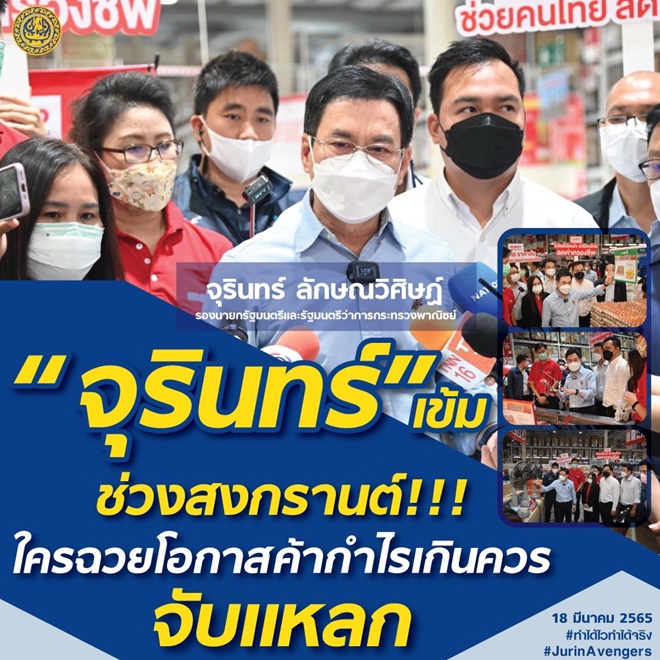 จากนั้นผู้สื่อข่าวได้ถามว่าในช่วงสงกรานต์ จะมีการฉวยโอกาสขึ้นราคาสินค้าหรือไม่ นายจุรินทร์ กล่าวว่า ไม่มีสิทธิ์ที่อยู่ๆจะมาขึ้นราคา ถ้าขึ้นราคาจนกลายเป็นการค้ากำไรเกินควรต้องดำเนินคดีตามกฎหมาย ข้อหาค้ากำไรเกินควร พาณิชย์จังหวัดจะคอยตรวจตรา อย่างไรก็ตามขอความร่วมมือพี่น้องประชาชนช่วยเป็นหูเป็นตา ถ้าที่ไหนขึ้นราคาเกินพอดีและรู้สึกเอารัดเอาเปรียบมากไป ให้แจ้งสายด่วน 1569 จะมีผู้รับสายและช่วงดึกจะมีการบันทึกสายไว้ และสั่งการให้พาณิชย์จังหวัดตรวจสอบ ถ้าพบความผิดจริงจะดำเนินคดี กระทรวงพาณิชย์จะช่วยดูและผู้บริโภคก็ช่วยเป็นหูเป็นตาให้อีกทางหนึ่ง รวมถึงกลุ่มบริการด้วย ถ้าผิดจะจัดการให้