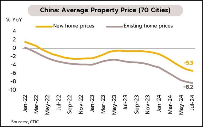 ความซบเซาในภาคอสังหาริมทรัพย์ของจีนกดดันเศรษฐกิจต่อเนื่อง ยอดขายบ้านใหม่ของผู้พัฒนาอสังหาริมทรัพย์ 100 อันดับแรกกลับมาหดตัวเร่งขึ้นจาก –17% YoY ในดือนมิถุนายนเป็น –19.7% ในเดือนกรกฎาคม หลังจากปรับตัวดีขึ้นเล็กน้อยช่วงเดือนเมษายนถึงมิถุนายน ขณะเดียวกันราคาบ้านใหม่และบ้านมือสองเฉลี่ยใน 70 เมืองลดลงต่อเนื่องจาก –4.9 % เป็น –5.3% และจาก –7.9% เป็น –8.2% ตามลำดับ หากจำแนกตามกลุ่มพบว่า ราคาบ้านใหม่ลดลงมากที่สุดในเมือง Tier-3 ที่ –5.9 % และราคาบ้านมือสองลดลงมากที่สุดในเมือง Tier-1 ที่ –8.8% นอกจากนี้ ผู้พัฒนาอสังหาริมทรัพย์บางรายยังคงเผชิญกับความเสี่ยงด้านสภาพคล่อง การผิดนัดชำระหนี้ หรือการฟ้องร้องชำระบัญชี เช่น Country Garden, Vanke ขณะที่หลายเมืองเริ่มผ่อนคลายหรือยกเลิกแนวทางการกำหนดราคาบ้านใหม่ขั้นต่ำ ส่วนรัฐบาลกลางกำลังพิจารณาให้รัฐบาลท้องถิ่นออกพันธบัตรเพื่อเข้าซื้ออุปทานบ้านส่วนเกินเพิ่มเติม