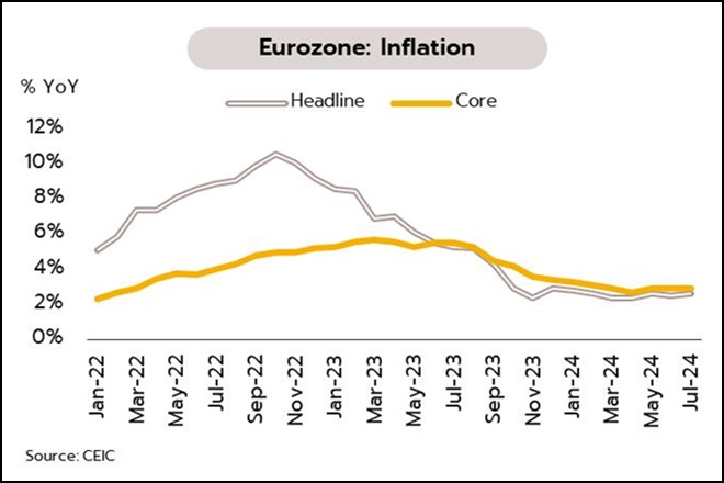 เศรษฐกิจยูโรโซนฟื้นตัวช้าท่ามกลางความไม่แน่นอนที่เพิ่มสูงขึ้น ในเดือนกรกฎาคม อัตราเงินเฟ้อทั่วไปเพิ่มขึ้น 2.6% YoY จากเดือนก่อนที่ 2.5% ส่วนอัตราเงินเฟ้อพื้นฐานเพิ่มขึ้น 2.9% ไม่เปลี่ยนแปลงจากเดือนก่อน นอกจากนี้ ในเดือนสิงหาคม ดัชนี PMI รวมภาคการผลิตและการบริการอยู่ที่ 51.2 เพิ่มขึ้นจากเดือนก่อนที่ 50.2 จากแรงหนุนของ PMI ภาคบริการที่ขยายตัวดีขึ้นสู่ระดับ 53.3 จากเดือนก่อนที่ 51.9 แต่ดัชนี PMI ภาคการผลิตยังคงหดตัวที่ 45.6