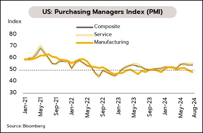 ตลาดแรงงานสหรัฐฯชะลอตัวชัดเจนขึ้น แต่โอกาสเกิดภาวะเศรษฐกิจถดถอยยังอยู่ในระดับต่ำ สุนทรพจน์ของนายเจอโรม พาวเวล ประธานเฟดในการประชุมประจำปีที่เมืองแจ็กสัน โฮล ระบุว่าใกล้ถึงเวลาเหมาะสมในการปรับลดอัตราดอกเบี้ยหลังอัตราเงินเฟ้อชะลอตัวและตลาดแรงงานลดความร้อนแรงลง ดัชนี PMI รวมภาคการผลิตและการบริการในเดือนสิงหาคมอยู่ที่ 54.1 ชะลอจากเดือนก่อนที่ 54.3 โดยดัชนี PMI ภาคการผลิตลดลงสู่จุดต่ำสุดในรอบ 8 เดือนที่ 48 อย่างไรก็ตาม เศรษฐกิจยังคงขยายตัวสะท้อนจากดัชนี PMI ภาคบริการเพิ่มขึ้นสู่ระดับ 55.2 นอกจากนี้ ยอดขายบ้านมือสองในเดือนกรกฎาคมเพิ่มขึ้น 1.3% MoM ขณะที่ยอดขายบ้านใหม่ปรับเพิ่มขึ้น 10.6%