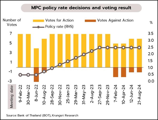 กนง.คงดอกเบี้ยด้วยมติไม่เป็นเอกฉันท์ ชี้พัฒนาการเศรษฐกิจยังเป็นไปตามคาด แต่ยังต้องติดตามสินเชื่อด้อยคุณภาพที่มีแนวโน้มเพิ่มขึ้น การประชุมคณะกรรมการนโยบายการเงิน (กนง.) ในวันที่ 21 สิงหาคม มีมติ 6 ต่อ 1 คงอัตราดอกเบี้ยนโยบายไว้ที่ 2.50% โดยประเมินเศรษฐกิจไทยมีแนวโน้มขยายตัวตามคาด ด้วยแรงขับเคลื่อนสำคัญจากการท่องเที่ยวและอุปสงค์ภายในประเทศ ขณะที่การส่งออกสินค้าและภาคอุตสาหกรรมฟื้นตัวอย่างค่อยเป็นค่อยไป ด้านอัตราเงินเฟ้อคาดว่าจะกลับเข้าสู่กรอบเป้าหมายภายในปลายปี 2567 ดังนั้น คณะกรรมการส่วนใหญ่จึงเห็นว่าอัตราดอกเบี้ยนโยบายปัจจุบันยังอยู่ในระดับที่สอดคล้องกับการขยายตัวของเศรษฐกิจที่โน้มเข้าสู่ศักยภาพและการรักษาเสถียรภาพเศรษฐกิจและการเงิน ขณะที่กรรมการ 1 ท่าน เห็นควรให้ปรับลดดอกเบี้ย 0.25% เพื่อให้สอดคล้องกับศักยภาพการขยายตัวทางเศรษฐกิจที่ต่ำลงจากปัจจัยเชิงโครงสร้างที่ชัดเจนขึ้น และเพื่อช่วยบรรเทาภาระหนี้ลูกหนี้ได้บ้าง