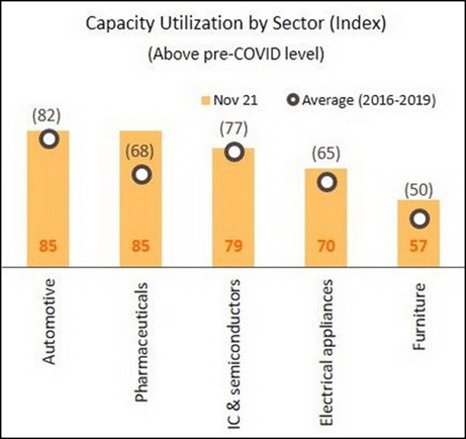ความเชื่อมั่นภาคอุตสาหกรรมปรับดีขึ้นต่อเนื่อง การใช้กำลังการผลิตในอุตสาหกรรมหลักเริ่มทยอยกลับสู่ช่วงก่อนเกิดการระบาดแล้ว ดัชนีความเชื่อมั่นภาคอุตสาหกรรมเดือนธันวาคม 2564 เพิ่มขึ้นต่อเนื่องเป็นเดือนที่ 4 สู่ระดับสูงสุดในรอบ 9 เดือนที่ 86.8 จาก 85.4 เดือนพฤศจิกายน ผลบวกจากการฟื้นตัวของอุปสงค์ในประเทศภายหลังจากทางการผ่อนคลายมาตรการควบคุมการระบาดเพิ่มเติม ส่งผลให้กิจกรรมทางเศรษฐกิจกลับมาดำเนินการได้มากขึ้นทางภาคการผลิต การค้า และการเดินทางในประเทศเพิ่มขึ้น รวมถึงการส่งออกที่เติบโตดีตามการฟื้นตัวของเศรษฐกิจประเทศคู่ค้า