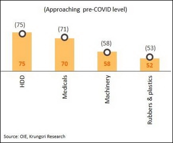 การฟื้นตัวของอุปสงค์ทั้งในและต่างประเทศช่วยหนุนให้การผลิตในภาคอุตสาหกรรมทยอยปรับดีขึ้น และล่าสุดอัตราการใช้กำลังการผลิตในปัจจุบัน โดยภาพรวมแม้จะยังอยู่ในระดับต่ำกว่าช่วงก่อนเกิดการระบาดของ COVID-19 (เดือนพฤศจิกายนอยู่ที่ 65.8% vs ก่อนระบาดเฉลี่ยอยู่ที่ 67.6%) แต่เริ่มมีบางอุตสาหกรรมสำคัญที่มีอัตราการใช้กำลังการผลิตกลับไปสูงกว่าช่วงก่อนเกิดการระบาดแล้ว อาทิ อุตสาหกรรมรถยนต์ เวชภัณฑ์ยา แผงวงจรไฟฟ้าและเซมิคอนดัคเตอร์ เครื่องใช้ไฟฟ้า และเฟอร์นิเจอร์ ขณะเดียวกันการใช้กำลังการผลิตในบางอุตสาหกรรมกำลังเข้าใกล้ระดับก่อนเกิดการระบาด ได้แก่ HDD, เครื่องมือแพทย์ เครื่องจักร ผลิตภัณฑ์ยางและพลาสติก ทั้งนี้ แนวโน้มการส่งออกของไทยในปีนี้ซึ่งคาดว่าจะยังเติบโตต่อเนื่องจากปีก่อนที่ 5% บวกกับการทยอยฟื้นตัวของกิจกรรมทางเศรษฐกิจในประเทศจะเป็นปัจจัยสำคัญที่จะช่วยหนุนการขยายตัวของการผลิตและการลงทุนในภาคอุตสาหกรรมในปีนี้