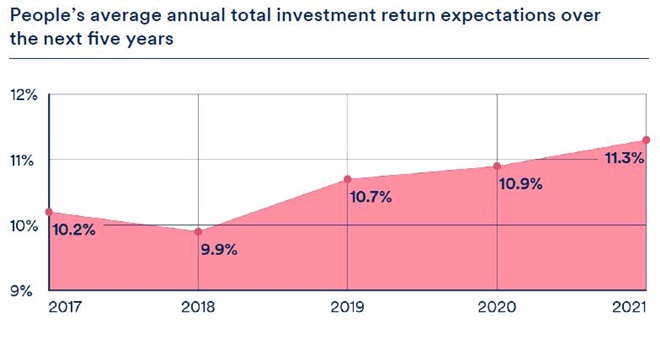 แม้ว่าจะเป็นปีที่มีความท้าทายอย่างมาก แต่นักลงทุนส่วนใหญ่มีความคาดหวังต่อผลตอบแทนในอนาคตที่สูงขึ้นที่สุดนับตั้งแต่เริ่มทำการสำรวจในปี 2559 โดยนักลงทุนคาดหวังผลตอบแทนเฉลี่ยปีละ 11.3% ในช่วงเวลา 5 ปีนับจากนี้ ซึ่งสูงกว่าการสำรวจในปีที่ผ่านมา ซึ่งคาดหวังที่ 10.9%