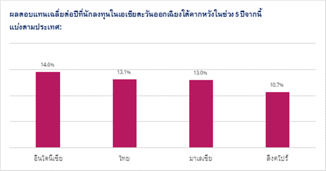 นักลงทุนจากเอเชียตะวันออกเฉียงใต้เป็นกลุ่มที่มีมุมมองในแง่ดีต่อผลตอบแทนในอนาคตมากที่สุด โดยคาดหวังผลตอบแทนรวมต่อปีสูงถึง 12.8% ในช่วง 5 ปีนับจากนี้ รองลงมาคือนักลงทุนในอเมริกา (12.5%) ภูมิภาคอื่นๆ ในเอเชีย (12.3%) ขณะที่นักลงทุนในยุโรปมีมุมมองที่ค่อนข้างระมัดระวังโดยคาดหวังผลตอบแทนเฉลี่ยต่อปีที่ 9.7%