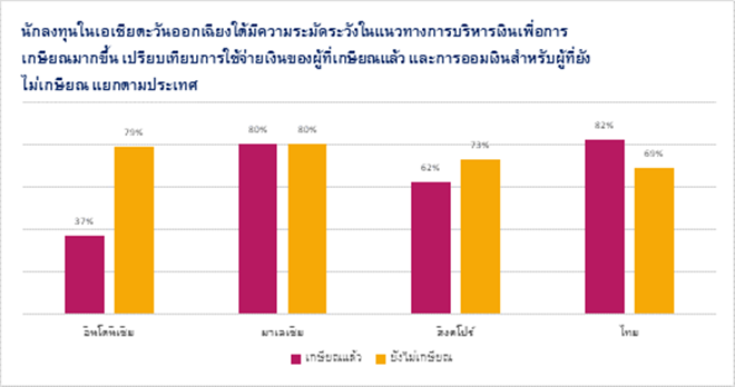 แนวทางการลงทุนอย่างระมัดระวังสะท้อนผ่านมุมมองการลงทุนเพื่อการเกษียณของนักลงทุน โดย 65% ของผู้ที่เกษียณอายุแล้วในภูมิภาคเอเชียตะวันออกเฉียงใต้ มีความระมัดระวังในการใช้จ่ายเงินมากขึ้น (เทียบกับนักลงทุนวัยเกษียณทั่วโลก ซึ่งอยู่ที่ 58%) ในขณะที่ 75% ของผู้ที่ยังไม่ถึงวัยเกษียณต้องการเก็บออมเงินเพื่อใช้ในการเกษียณเพิ่มขึ้น (เทียบกับนักลงทุนทั่วโลก ซึ่งอยู่ที่ 67%)