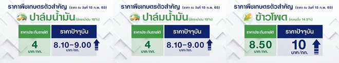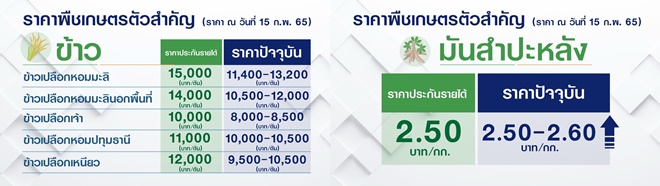 มันสำปะหลัง ราคาประกัน 2.50 บาท/กก. ปัจจุบันราคา 2.50-2.60 บาท/กก. สูงกว่าราคาประกัน ,ยางพาราปัจจุบันสูงกว่าราคาประกันรายได้ คือ ยางแผ่นดิบชั้น 3 ราคาประกัน 60 บาท/กก.ราคาปัจจุบัน 60.55 บาท/กก. น้ำยางสด ราคาประกัน 57 บาท/กก. ราคาปัจจุบัน 65 บาท/กก. ยางก้อนถ้วย (DRC 50%): ราคาประกัน 23 บาท/กก. ราคาปัจจุบัน 25.65 บาท/กก. ส่วนปาล์มน้ำมัน (อัตราน้ำมัน 18%) : ราคาประกัน 4 บ./กก.ราคาปัจจุบัน 8.10-9.00 บาท/กก. สูงกว่าประกัน ,ข้าวโพด (ความชื้น 14.5%) : ราคาประกัน 8.50 บาท/กก. ราคาปัจจุบัน 10 บาท/กก. สูงกว่าประกัน ทั้งนี้มีเฉพาะข้าวที่ราคายังไม่สูงกว่าราคาประกันรายได้แต่เกษตรกรได้ประโยชน์โดยเงินส่วนต่างที่โอนเข้าบัญชีเกษตรกรโดยตรงเหมือนกันทั่วประเทศ ในส่วนที่เป็นพืชเกษตรราคาสูงกว่าการประกันรายได้ประชาชนก็ได้รับประโยชน์เต็มเหนี่ยวเพราะการบริหารจัดการทั้งมาตรการหลักและมาตรการเสริมของรัฐบาล