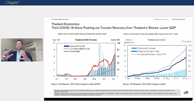 นายซาเมียร์ เดชพานดิ หัวหน้าที่ปรึกษาการลงทุนระดับภูมิภาค ซิตี้แบงก์ เอเชียแปซิฟิก และตะวันออกกลาง กล่าวว่า แม้สถานการณ์แพร่ระบาดของโควิด-19 ทั่วโลกยังคงดำเนินอยู่อย่างต่อเนื่อง แต่นักวิเคราะห์ซิตี้คาดการณ์ว่าภาพรวมระบบเศรษฐกิจทั่วโลกในช่วงครึ่งหลังปี 2564 แม้ว่ายังไม่สามารถกลับไปเท่าจุดก่อนที่มีการระบาดได้ แต่จะเป็นการฟื้นตัวหลากหลายรูปแบบในแต่ละภูมิภาค จากปัจจัยแรงหนุนจากภาคธุรกิจบางส่วนที่เริ่มกลับมาเปิดใหม่ การฉีดวัคซีนป้องกันโรคโควิด-19 ที่มากขึ้นในหลายประเทศ มาตรการกระตุ้นเศรษฐกิจและการคลังทั่วโลกที่มีประสิทธิภาพ ภาครัฐที่สนับสนุนการขยายตัวของภาคบริการในวงกว้างมากขึ้น การเปลี่ยนแปลงทางเทคโนโลยีที่เข้ามามีบทบาทในการช่วยชีวิตผู้คนมากขึ้นอีกด้วย