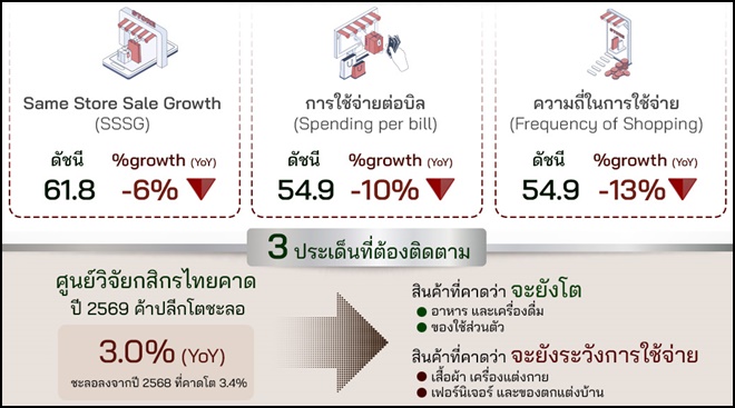 • ศูนย์วิจัยกสิกรไทยคาดว่า ปี 2569 ยอดขายค้าปลีกจะเติบโตที่ 3.0% ชะลอลงจากปี 2568 ที่คาดว่าจะโต 3.4% โดยสินค้าที่ยังโตได้จะอยู่ในหมวดอาหารและเครื่องดื่ม รวมถึงของใช้ส่วนตัว ส่วนสินค้าที่คาดว่าผู้บริโภคจะยังระมัดระวังการใช้จ่าย ได้แก่ เสื้อผ้า เครื่องแต่งกาย และเฟอร์นิเจอร์ ของตกแต่งบ้าน