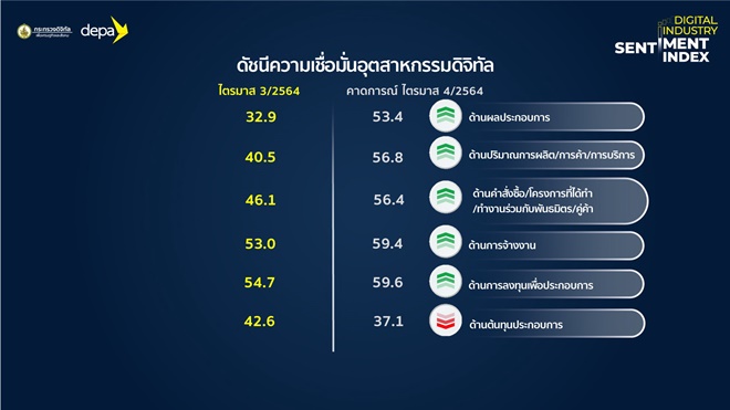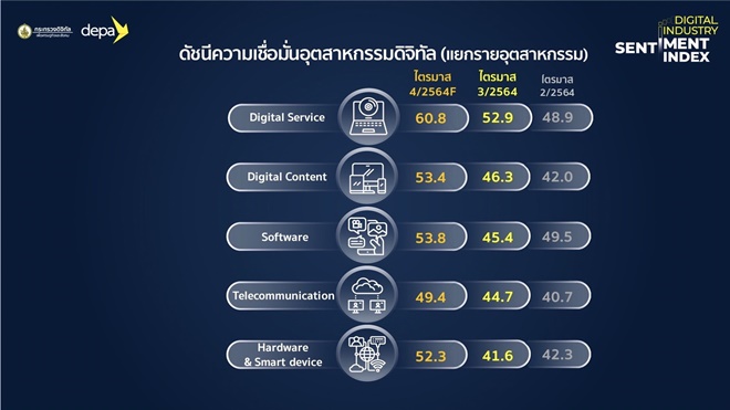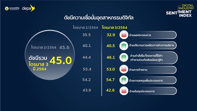 สำนักงานส่งเสริมเศรษฐกิจดิจิทัล หรือ ดีป้า แถลงผลการสำรวจดัชนีความเชื่อมั่นอุตสาหกรรมดิจิทัล (Digital Sentiment Index) ไตรมาส 3 ประจำปี 2564 ใน 5 กลุ่มอุตสาหกรรมย่อย ประกอบด้วย กลุ่มอุตสาหกรรมฮาร์ดแวร์และอุปกรณ์อัจฉริยะ กลุ่มอุตสาหกรรมซอฟต์แวร์ กลุ่มอุตสาหกรรมบริการด้านดิจิทัล กลุ่มอุตสาหกรรมดิจิทัลคอนเทนต์ และกลุ่มอุตสาหกรรมโทรคมนาคม โดยดัชนีความเชื่อมั่นฯ อยู่ที่ระดับ 45.0 ทรงตัวจากระดับ 45.6 ของไตรมาส 2 ในเกือบทุกองค์ประกอบ ทั้งด้านปริมาณ การผลิต และการลงทุน