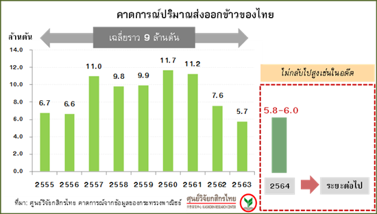 สำหรับในปี 2564 ศูนย์วิจัยกสิกรไทย มองว่า การส่งออกข้าวของไทยในปี 2564 อาจยังประคองตัวได้ในกรอบจำกัดอยู่ที่ราว 5.8-6.0 ล้านตัน หรือเพิ่มขึ้นร้อยละ 1.3-4.8 (YoY) ซึ่งแม้การส่งออกข้าวไทยจะได้รับแรงหนุนจากปัจจัยบวกคือ ปริมาณน้ำฝนที่มากขึ้นจากการเข้าสู่วงรอบของลานีญา ทำให้มีปริมาณผลผลิตข้าวเพิ่มขึ้น ผนวกกับเกษตรกรมีแรงจูงใจในการปลูกข้าวต่อไปจากมาตรการช่วยเหลือของภาครัฐ แต่คงต้องยอมรับว่า การส่งออกข้าวไทยจะยังคงต้องเผชิญปัจจัยลบที่ยังมีอยู่ต่อเนื่องจากปีก่อน แม้ปัจจัยลบดังกล่าวจะให้ภาพที่ดีขึ้นบ้างแล้วก็ตาม ทั้งในเรื่องของการแพร่ระบาดของโควิด-19 ที่ให้ภาพคลี่คลายขึ้น รวมถึงปัญหาเรื่องการขาดแคลนตู้คอนเทนเนอร์ที่น่าจะได้รับการแก้ไขให้ดีขึ้นกว่าปีก่อน นอกจากนี้ ค่าเงินบาทที่แข็งค่า จะยังเป็นปัจจัยกดดันต่อความสามารถในการแข่งขันด้านราคา สุดท้าย จะทำให้ภาพรวมการส่งออกข้าวของไทยในปีนี้น่าจะสามารถประคองการเติบโตได้แต่คงอยู่ในกรอบที่จำกัด ซึ่งจะทำให้ไทยสามารถรักษาส่วนแบ่งตลาดส่งออกข้าวในโลกไว้ได้ใกล้เคียงกับปีก่อนที่ราวร้อยละ 12.8 นอกจากนี้ ยังมองว่า จากนี้ไปไทยน่าจะไม่สามารถกลับไปเป็นแชมป์การส่งออกข้าวโลกได้อีกแล้วดังเช่นในอดีตและที่ไทยเคยส่งออกข้าวเฉลี่ยได้สูงถึงราว 9 ล้านตันต่อปี เนื่องจากการแข่งขันในตลาดโลกที่รุนแรงขึ้น รวมถึงราคาข้าวไทยที่ยังสูงกว่าคู่แข่งโดยเปรียบเทียบ ดังนั้น ไทยควรมุ่งไปที่การผลิตข้าวที่เน้นการแข่งขันในเชิงมูลค่ามากกว่าเชิงปริมาณ (ที่เน้นไปแค่เพียงการจัดอันดับของผู้ส่งออกข้าวในโลกเท่านั้น โดยไม่ได้คำนึงถึงด้านคุณภาพข้าว) ทำให้ความหวังของการส่งออกข้าวไทยในระยะข้างหน้าคงอยู่ที่การให้ความสำคัญกับตัวชูโรงอย่างข้าวหอมมะลิที่ควรเร่งเพิ่มการผลิตเพื่อใช้ในการส่งออกและบริโภคในประเทศ ขณะที่ในด้านราคาก็น่าจะอยู่ในเกณฑ์ดีกว่าข้าวประเภทอื่น จึงนับว่าข้าวหอมมะลิน่าจะมีโอกาสและศักยภาพมากที่สุดในพันธุ์ข้าวที่ไทยมี ณ ขณะนี้