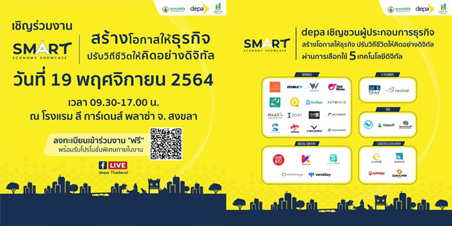 “และเพื่อให้เกิดความต่อเนื่อง ดีป้า จึงกำหนดจัดงานแถลงข่าวและพิธีเปิดกิจกรรมส่งเสริมการประยุกต์ใช้เทคโนโลยีและนวัตกรรมดิจิทัล เพื่อขับเคลื่อนเมืองเศรษฐกิจอัจฉริยะต้นแบบ (Smart Economy Showcase) ในพื้นที่จังหวัดสงขลาในวันศุกร์ที่ 19 พฤศจิกายนนี้ ณ โรงแรมลี การ์เดนส์ พลาซ่า โดยได้รับเกียรติจาก นายชัยวุฒิ ธนาคมานุสรณ์ รัฐมนตรีว่าการกระทรวงดิจิทัลเพื่อเศรษฐกิจและสังคม เป็นประธานในพิธี ซึ่ง   ดีป้า หวังว่า Smart Economy Showcase จังหวัดสงขลาจะช่วยให้ผู้ประกอบการที่สนใจสามารถเข้าถึงเทคโนโลยีดิจิทัลจากดิจิทัลสตาร์ทอัพสัญชาติไทยกว่า 30 ราย พูดคุย และรับปรึกษา ก่อนเลือกประยุกต์ใช้เทคโนโลยีดิจิทัลที่เหมาะสมกับธุรกิจ เพื่อเพิ่มศักยภาพการดำเนินธุรกิจ และสร้างความพร้อมสำหรับการเปิดประเทศ โอกาสนี้จึงขอเชิญชวนพี่น้องผู้ประกอบการในพื้นที่และจังหวัดใกล้เคียงร่วมงาน Smart Economy Showcase จังหวัดสงขลา โดยไม่เสียค่าใช้จ่ายแต่อย่างใด” ผู้อำนวยการใหญ่ ดีป้า กล่าว