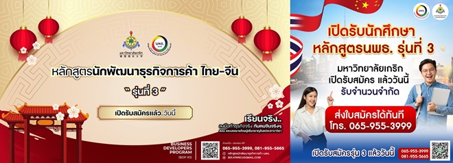 มหาวิทยาลัยเกริก ร่วมกับสมาคมเครือข่ายที่ปรึกษาวิสาหกิจขนาดกลางและขนาดย่อม เปิดรับสมัครหลักสูตรนักพัฒนาธุรกิจการค้าไทย – จีน รุ่นที่ 3 (นพธ.3) สำหรับนักธุรกิจ ผู้ประกอบการ SMEs และผู้ที่สนใจโอกาสทางการค้ากับประเทศจีน เรียนแบบ Work – Based Learning (WBL) มีทั้งภาคทฤษฎี ภาคปฏิบัติ ภาคศึกษาดูงานทั้งในไทยและจีน