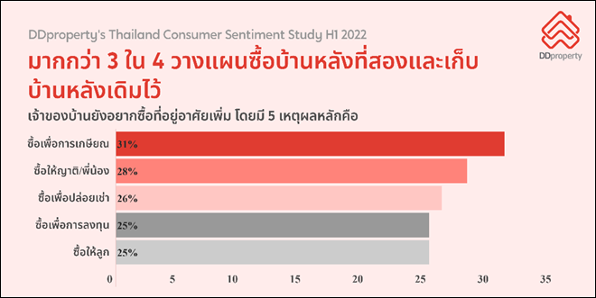 • คนวางแผนซื้อบ้านเพิ่ม รองรับแผนเกษียณ พบผู้บริโภคมากกว่า 3 ใน 4 (78%) ที่เป็นเจ้าของบ้านอยู่แล้วยังคงต้องการซื้อที่อยู่อาศัยเพิ่ม โดยมองว่าการซื้ออสังหาริมทรัพย์เพิ่มนั้นไม่ได้ตอบโจทย์การอยู่อาศัยเท่านั้น แต่วางแผนต่อยอดการใช้ชีวิตเพื่อความมั่นคงในอนาคตด้วย โดยเป้าหมายยอดนิยมของการซื้อบ้านเพิ่มอันดับต้น ๆ ของผู้บริโภค คือ ซื้อไว้รองรับแผนเกษียณอายุในอนาคต (31%) ตามมาด้วยการซื้อให้ญาติหรือพี่น้อง (28%) และซื้อปล่อยเช่าสร้างรายได้ระยะยาว (26%) นอกจากนี้ ยังพบว่า 46% ของผู้บริโภคที่เป็นเจ้าของบ้านปัจจุบันนั้นยังมีแผนที่จะซื้อที่อยู่อาศัยเพิ่มภายในช่วง 1 ปีข้างหน้านี้ สะท้อนให้เห็นว่ากลุ่มผู้บริโภคที่มีกำลังซื้อและมีความพร้อมทางการเงินกลับมามีความมั่นใจที่จะจับจ่ายใช้สอยมากขึ้น