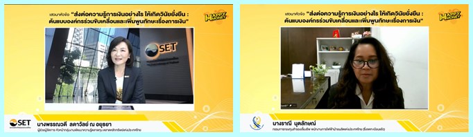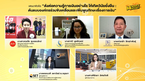 จึงขอเชิญชวนองค์กรทั้งภาครัฐและเอกชนมาร่วมกันเผยแพร่ความรู้ด้านวางแผนการเงิน (Financial Literacy)  โดยตลาดหลักทรัพย์ฯ เป็นแกนกลางในการสนับสนุนองค์ความรู้ รวมถึงการสร้างพี่เลี้ยงการเงิน ซึ่งเป็นรูปแบบการเรียนรู้ที่ได้พัฒนาขึ้นเพื่อมุ่งหวังให้เกิดการปรับเปลี่ยนพฤติกรรมในที่สุด สำหรับองค์กรที่สนใจจะเผยแพร่องค์ความรู้ด้านการเงินให้กับพนักงานหรือคนทั่วไป สามารถดูรายละเอียดเพิ่มเติมที่ www.set.or.th/happymoneyหรือ  SET Contact Center 0-2009-9999