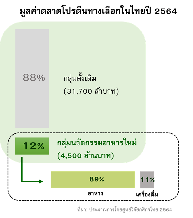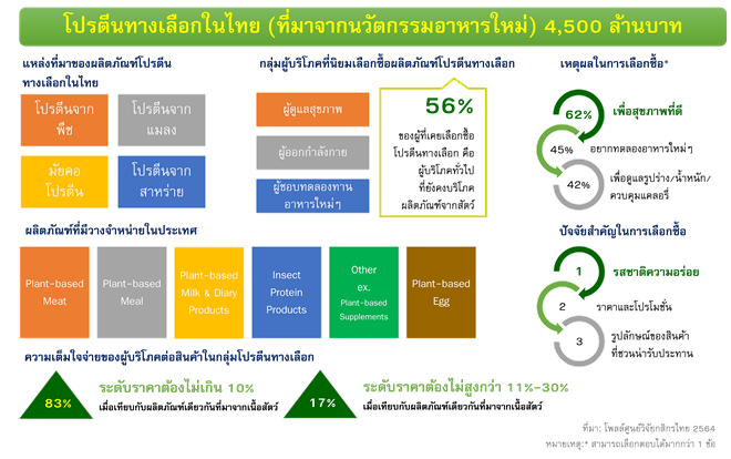 สำหรับไทย สินค้ากลุ่มโปรตีนทางเลือกดั้งเดิมที่ผู้บริโภคคุ้นเคยจะอยู่ในกลุ่มโปรตีนเกษตร เครื่องดื่มนมถั่วเหลือง ซึ่งสามารถผลิตได้โดยกระบวนการผลิตที่ไม่ซับซ้อนมากนัก แต่ปัจจุบันพบว่า สินค้าโปรตีนทางเลือกในกลุ่มนวัตกรรมอาหารใหม่ที่ต้องใช้เทคโนโลยีการผลิตขั้นสูงและซับซ้อนมากขึ้น เพื่อพัฒนาให้มีรสชาติ เนื้อสัมผัส ตลอดจนรูปลักษณ์ที่คล้ายผลิตภัณฑ์จากสัตว์มากที่สุด ได้ถูกผลิตโดยผู้ประกอบการไทยและทยอยออกสู่ตลาดมากขึ้น ทั้งที่มาจากผู้ประกอบการรายใหญ่ กลุ่ม Startup รวมถึง SMEs บางรายที่มีศักยภาพ โดยสินค้าส่วนใหญ่ที่วางจำหน่ายจะอยู่ในกลุ่มของโปรตีนจากพืชในรูปแบบเนื้อสัตว์ทดแทน (Plant-based Meat) เช่น เนื้อบดจากพืช เบอร์เกอร์หมูจากพืช กลุ่มอาหารสำเร็จรูปพร้อมทาน (Plant-based Meal) เช่น ซาลาเปาเนื้อจากพืช ข้าวกะเพราเนื้อจากพืช เป็นต้น ผลิตภัณฑ์จากนมที่มาจากพืชทางเลือก (Plant-based Milk & Diary Products) เช่น นมอัลมอนด์ มายองเนส-น้ำสลัดจากพืช รวมถึงผลิตภัณฑ์แมลงแปรรูป (Insect Protein Products) เช่น ผงโปรตีนจากแมลง ไส้กรอกจากแมลง เป็นต้น