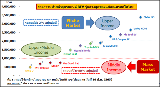 • รถยนต์ BEV ในกลุ่มตลาด Niche ที่เป็นรถหรูราคาเกิน 2 ล้านบาทต่อคัน มีโอกาสขยับราคาลงมาชนกับรถยนต์ BEV ญี่ปุ่นที่อยู่ระดับราคาใกล้ 2 ล้านบาท โดยเฉพาะอย่างยิ่งเมื่อมีการผลิตในประเทศ ทำให้ผู้บริโภคที่มีระดับรายได้ค่อนไปทางสูงมีทางเลือกในตลาดรถหรูมากขึ้น