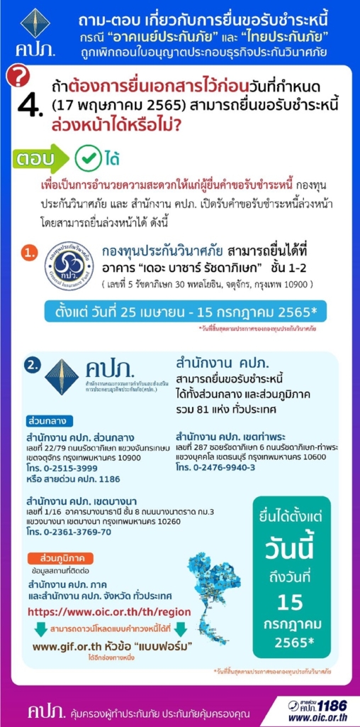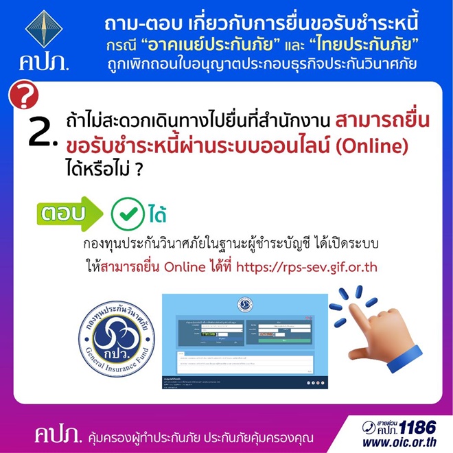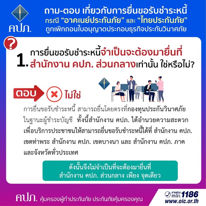 เพื่อความกระจ่างชัด คปภ.ได้จัดทำคำถามและคำตอบเกี่ยวกับการยื่นขอรับชำระหนี้ กรณี “อาคเนย์ประกันภัย” และไทยประกันภัย”ถูกเพิกถอนใบอนุญาตประกอบธุรกิจประกันวินาศภัย ดังนี้
