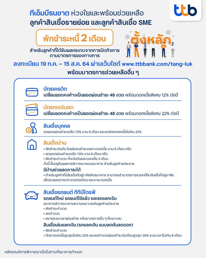 ทีเอ็มบีธนชาต หรือ ทีทีบี (ttb) เดินหน้ามาตรการ “ตั้งหลัก” เพื่อให้ความช่วยเหลือด้านการเงินเพิ่มเติมแก่ลูกค้าทุกกลุ่มของธนาคาร ที่ได้รับผลกระทบจากสถานการณ์การแพร่ระบาดของโรคโควิด-19 โดยล่าสุด ธนาคารออกมาตรการพิเศษตามแนวทางของธนาคารแห่งประเทศไทย (ธปท.) เพื่อให้ความช่วยเหลือแก่ลูกค้าที่ได้รับผลกระทบจากการยกระดับมาตรการป้องกันการควบคุมโรค ตามคำสั่งของ ศูนย์บริหารสถานการณ์แพร่ระบาดของโรคติดเชื้อไวรัสโคโรนา 2019 (ศบค.) โดยพักการชำระเงินต้นและดอกเบี้ยเป็นระยะเวลา 2 เดือน ให้กับลูกค้าบัตรเครดิต บัตรกดเงินสด สินเชื่อบ้าน สินเชื่อบุคคล สินเชื่อรถยนต์ ทีทีบีไดรฟ์ และลูกค้าสินเชื่อเอสเอ็มอี ซึ่งเป็นกลุ่มที่ได้รับผลกระทบโดยตรง ประกอบด้วย ลูกค้าที่เป็นนายจ้างและลูกจ้างในสถานประกอบการ ทั้งในพื้นที่ควบคุมฯ และนอกพื้นที่ควบคุมฯ ที่ต้องปิดกิจการจากมาตรการของทางการ และมาตรการช่วยเหลืออื่น ๆ