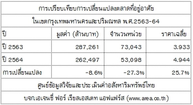 จากข้อมูลของปี 2563 มีการเปิดตัวที่อยู่อาศัย 73,043 หน่วย รวมมูลค่า 287,261 ล้านบาท ดังนั้น ที่อยู่อาศัยจึงเปิดตัวลดลงเป็นอย่างมากโดยลดลงถึง 27.3% ในด้านจำนวนหน่วยเปิดใหม่ แต่มูลค่าอาจลดลงเพียง 8.6% และเนื่องจากผู้มีรายได้น้อย และปานกลางค่อนข้างน้อย มีความสามารถในการซื้อที่จำกัดในภาวะวิกฤติโควิด-19 นี้ ผู้ประกอบการจึงเน้นเปิดโครงการที่มีราคาค่อนข้างสูง จึงทำให้ราคาเฉลี่ยต่อหน่วยเพิ่มสูงขึ้นจาก 3.933 ล้านบาท เป็น 4.944 ล้านบาท หรือราคาขายเฉลี่ยเพิ่มขึ้นถึง 25.7% นั่นเอง