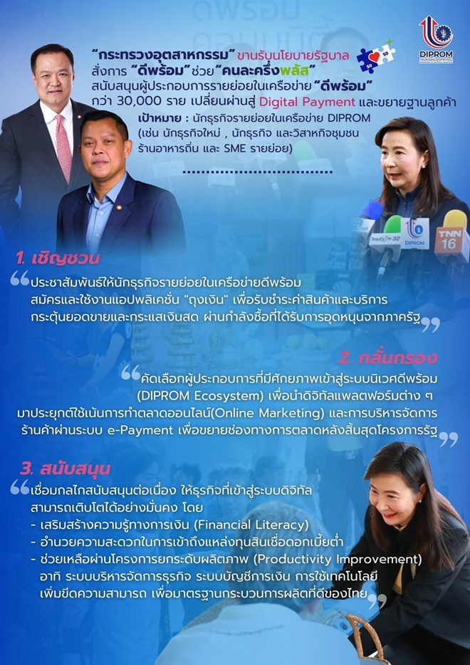 นายธนกร กล่าวต่อว่า สำหรับนักธุรกิจรายย่อยในเครือข่าย DIPROM เช่น นักธุรกิจใหม่ นักธุรกิจ และวิสาหกิจชุมชน ร้านอาหารถิ่น และ SME รายย่อย กระทรวงอุตสาหกรรมจะดำเนินการผ่าน 3 ยุทธ์ศาสตร์สำคัญ คือ