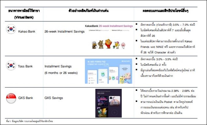 – อย่างไรก็ตาม ในกรณีของไทย ลูกเล่นของผลิตภัณฑ์ทั้งเงินฝากและสินเชื่อข้างต้น ธนาคารพาณิชย์ไทยในปัจจุบันสามารถลงมาแข่งขันได้ ยกตัวอย่างเช่น ผลิตภัณฑ์เงินฝากที่ให้อัตราดอกเบี้ยรายเดือน การแยก Cloud Pocket เพื่อให้มีการออมตามวัตถุประสงค์ที่กำหนด การเปลี่ยนภาพพื้นหลังของสลิปเงินโอนได้ตามตัวเลือกที่ต้องการ ส่วนด้านสินเชื่อ ก็มีการให้บริการสินเชื่อดิจิทัลในวงเงินขนาดเล็กให้แก่ลูกค้ารายย่อยด้วยระยะเวลาอนุมัติในหลักชั่วโมง เป็นต้น