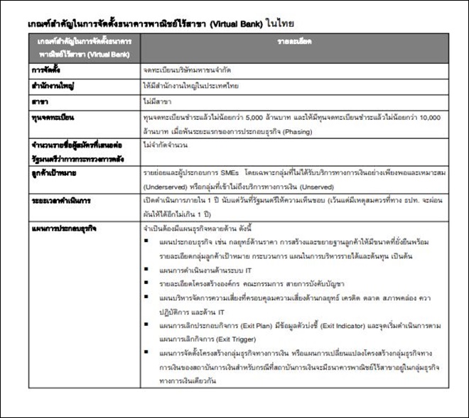 – ประเด็นจับตา จึงอยู่ที่การตีกรอบเงื่อนไขของการทำธุรกิจธนาคารพาณิชย์ไร้สาขาของไทย ที่ทางการกำหนดว่าจะต้องให้บริการกับกลุ่มที่ไม่ได้รับบริการทางการเงินอย่างเพียงพอและเหมาะสม (Underserved) หรือกลุ่มที่เข้าไม่ถึงบริการทางการเงิน (Unserved) ซึ่งจะแตกต่างจากกรณีของเกาหลีใต้ หรือสิงค์โปร์ ที่เน้นการให้ใบอนุญาตธนาคารพาณิชย์ไร้สาขาเพื่อเพิ่มการแข่งขันในตลาดมากกว่าจะเน้นการเพิ่มการเข้าถึงบริการทางการเงิน (Financial Inclusion) ให้กับกลุ่มประชากรข้างต้น