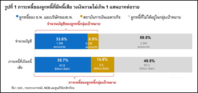- กลุ่มเป้าหมายของการแก้ NPL รายย่อยในเฟสแรก เปิดให้เฉพาะลูกหนี้ธนาคารพาณิชย์และนอนแบงก์ที่เป็นเครือของธนาคารพาณิชย์ 1.6 ล้านบัญชี และลูกหนี้ของ SFIs 3.3 แสนบัญชี (รูปที่ 1) ดังนั้นจึงมีลูกหนี้ซึ่งอยู่กับสถาบันการเงินอื่นอีกประมาณ 2.8 ล้านบัญชีที่อยู่ระหว่าง/รอการปรับโครงสร้างหนี้ (สัดส่วนประมาณ 59.5% ของบัญชีที่มียอดหนี้ไม่เกิน 1 แสนบาทที่จำนวนทั้งหมด 4.7 ล้านบัญชี)