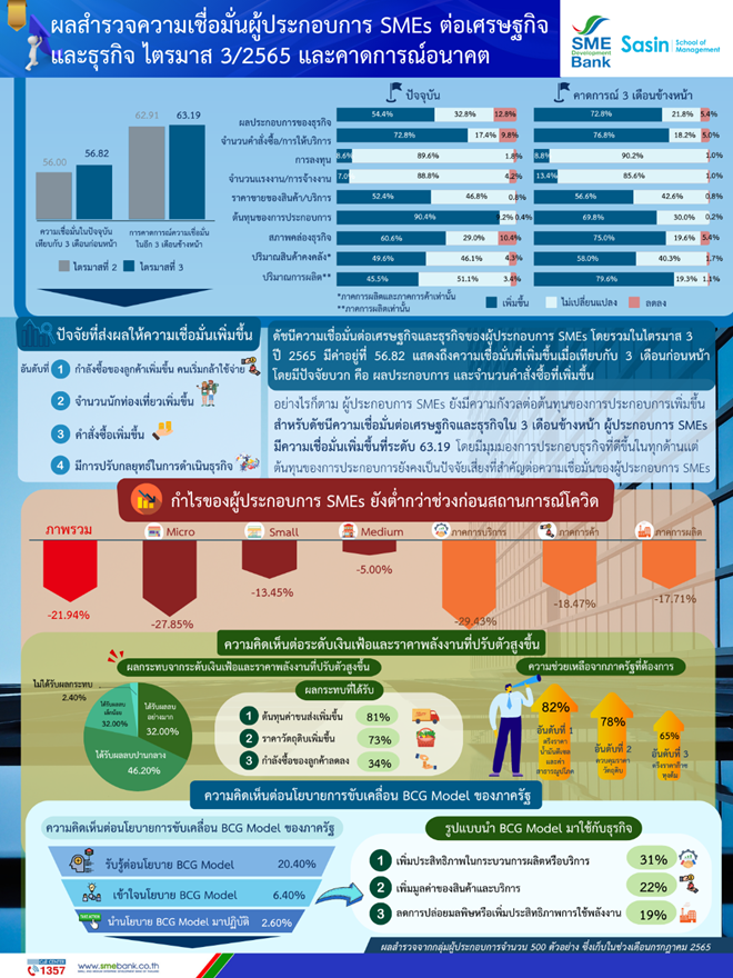ดร.มยุขพันธุ์ ไชยมั่นคง ผู้อำนวยการโครงการ ศูนย์วิจัยและให้คำปรึกษา สถาบันบัณฑิตบริหารธุรกิจ ศศินทร์ แห่งจุฬาลงกรณ์มหาวิทยาลัย อธิบายเสริมว่า จากการสำรวจ SMEs จำนวน 500 ตัวอย่างทั่วประเทศ ครอบคลุมทุกประเภทอุตสาหกรรม ดัชนีความเชื่อมั่นต่อเศรษฐกิจและธุรกิจในไตรมาส 3 อยู่ที่ระดับ 56.82 ปรับตัวเพิ่มขึ้นจากไตรมาสที่ 2 ซึ่งอยู่ในระดับ 56.00  จากปัจจัยบวกกำลังซื้อและการจับจ่ายภายในประเทศที่ปรับตัวเพิ่มขึ้น รวมถึงจำนวนนักท่องเที่ยวที่เพิ่มขึ้น ในขณะที่ความกังวลต่อภาวะต้นทุนสูงก็เพิ่มขึ้นเช่นกัน