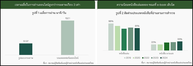 อย่างไรก็ตาม เวลาที่ใช้ในการอ่านออนไลน์ยังมากกว่าหนังสือเล่มถึง 100.7 นาที (รูปที่ 1) เนื่องจากการเข้าถึงข้อมูลได้หลากหลายและสะดวกกว่า ไม่ว่าจะเป็นการอ่านหนังสือพิมพ์และนิยายออนไลน์ รวมไปถึงการอ่านหนังสือในรูปแบบดิจิทัล (e-book)