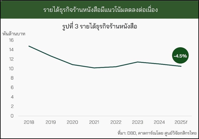 รายได้ร้านหนังสือยังหดตัวแต่ชะลอลง โดยปี 2025 คาดลดลงเพียง 4.5% เทียบกับที่เคยหดตัวเฉลี่ย 14% ต่อปี ก่อนโควิด-19