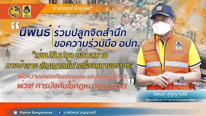 นอกจากนี้ผมขอความร่วมมือถึงพี่น้ององค์กรปกครองส่วนท้องถิ่นทุกระดับ ทั้ง อบจ. เทศบาลเมือง เทศบาลตำบล อบต. ไปจนถึงหมู่บ้าน โรงเรียนและชุมชน ขอให้ร่วมมือกันปรับปรุง ซ่อมแซมทาสีสัญลักษณ์ทางม้าลายที่มีในพื้นที่ของส่วนท้องถิ่นให้มองเห็นได้ชัดเจน มีป้ายบอกแจ้งเตือนก่อนเข้าเขตชุมชน หรือโรงเรียน หรือหน้าตลาด จุดสัญจรของประชาชนที่พลุกพล่านทั่วประเทศ รวมถึงบริเวณทางเดินเท้า ฟุตบาทต้องเป็นพื้นที่ปลอดภัยสำหรับประชาชนเดินเท้า ทั้งยังรวมถึง การบังคับใช้กฎหมายจราจรที่รัดกุม เข้มงวด และการตรวจสอบ ปรับปรุง ซ่อมแซมสัญญาณไฟจราจร จุดให้ไฟแสงสว่างบนท้องถนน เครื่องหมายจราจรต่างๆที่เป็นสัญลักษณ์แจ้งเตือนทั้งผู้ใช้รถ และคนเดินเท้าให้สามารถมองเห็นได้สะดวก ระยะไกล และชัดเจนเพื่อลดการเกิดอุบัติเหตุและลดความสูญเสียที่ไม่มีใครอยากให้เกิดขึ้นกับบุคคลอันเป็นที่รักของครอบครัวของทุกคน หากเราทุกฝ่ายร่วมมือ ร่วมใจทำ โดยการสร้างปลูกจิตสำนึกสาธารณะ ที่เอาใจเขา มาใส่ใจเรา ผมเชื่อว่าจะสามารถลดความสูญเสียที่ไม่มีใครอยากให้เกิดขึ้นนี้ได้ มาร่วมมือช่วยกันสร้างสังคมที่ปลอดภัยและดีกว่าเดิมด้วยกัน” นายนิพนธ์ กล่าว