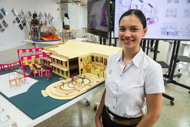 อย่างไรก็ตาม เมื่อพูดถึงงานที่จะนำเสนอเสนอในปีสุดท้าย ได้นำเสนอแบบจำลองทางกายภาพของ Queen Sirikit Museum of Textiles ที่นำมาพัฒนางานตามความสนใจของตนเอง ผ่านสตูดิโอการออกแบบ 10 แห่ง ซึ่งแต่ละแห่งจะนำเสนอแนวคิดที่แตกต่างรวมถึงสื่อที่เราจะนำเสนอการออกแบบของเราด้วย โดยได้เลือกสตูดิโอที่จะนำเสนอวิธีการออกแบบผ่านแบบจำลองทางกายภาพและผลักดันแนวคิดที่ว่า “แบบจำลองก็เพียงพอแล้ว” จึงเน้นถึงหัตถกรรมผ้าไหมไทย ซึ่งมี Queen Sirikit เป็นบุคคลสำคัญในการสนับสนุนให้ผ้าไหมมีความนิยมและเป็นเอกลักษณ์สำคัญของไทย
