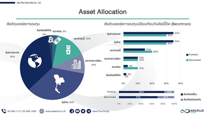 แม้สภาพแวดล้อมในการลงทุนสินทรัพย์เสี่ยงดูไม่เอื้ออำนวย จากประเด็นการแพร่ระบาด COVID-19 ในประเทศ รวมถึงความกังวล Tapering QE ในสหรัฐฯ คาด SET Index จะผันผวนในช่วงนี้ แต่อย่างไรก็ตามคาดหวังการฟื้นตัวในช่วงครึ่งหลังของปี จึงแนะนำให้ทยอยสะสมหุ้นพื้นฐานดี ซึ่งในการทำ Asset Allocation เรายังคงมุมมองเดิม โดยให้น้ำหนักการลงทุนในส่วนที่เป็นหุ้นค่อนข้างไปทาง Over Weight โดยจัดสรรเงินลงทุนในหุ้นไทย 35%และหุ้นต่างประเทศ 35%ส่วนตราสารหนี้ บนความคาดหมายว่าทิศทางอัตราดอกเบี้ยนโยบายจะคงที่ ขณะที่ Bond Yield ระยะยาวขยับสูงขึ้น จึงจัดสรรน้ำหนักการลงทุนแบบ Under Weight ให้น้ำหนักตราสารหนี้เพียง 15% ส่วนตราสารการลงทุนทางเลือกอื่นๆ ให้น้ำหนักการลงทุน 10% ส่วนที่เหลือแบ่งเป็นสินทรัพย์ดิจิทัล 2% และตลาดเงิน 3%