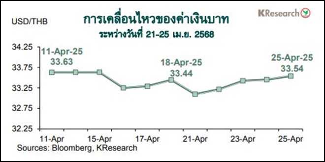สัปดาห์ระหว่างวันที่ 28 เม.ย.-2 พ.ค. 2568 ธนาคารกสิกรไทยมองกรอบการเคลื่อนไหวของค่าเงินบาทที่ระดับ 33.00-34.00 บาทต่อดอลลาร์ฯ ขณะที่ศูนย์วิจัยกสิกรไทยประเมินปัจจัยสำคัญที่ต้องติดตาม ได้แก่ ผลการประชุมกนง. (30 เม.ย.) รายงานเศรษฐกิจและการเงินเดือนมี.ค. ของไทย สถานการณ์ของสงครามการค้าสหรัฐฯ-จีน ราคาทองคำในตลาดโลก สัญญาณฟันด์โฟลว์ของต่างชาติ และผลการประชุม BOJ ขณะที่ตัวเลขเศรษฐกิจสหรัฐฯ ที่สำคัญ ได้แก่ เครื่องชี้แรงงาน JOLTS ดัชนีราคา PCE/Core PCE ยอดทำสัญญาขายบ้านที่รอปิดการขายเดือนมี.ค. ตัวเลขจีดีพีไตรมาส 1/2568 (adv.) ข้อมูลการจ้างงานภาคเอกชน ดัชนี PMI/ISM ภาคการผลิต ตัวเลขการจ้างงานนอกภาคเกษตรและอัตราการว่างงานเดือนเม.ย. รวมถึงจำนวนผู้ขอรับสวัสดิการว่างงานรายสัปดาห์ นอกจากนี้ตลาดยังรอติดตามดัชนี PMI เดือนเม.ย. ของจีน ญี่ปุ่น อังกฤษ และยูโรโซน ตัวเลขจีดีพีไตรมาส 1/2568 และอัตราเงินเฟ้อเดือนเม.ย. ของยูโรโซนด้วยเช่นกัน