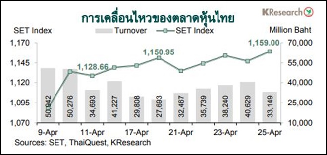 ในสัปดาห์นี้ (28 เม.ย.-2 พ.ค. 68) บริษัทหลักทรัพย์กสิกรไทย จำกัด มองว่า ดัชนีหุ้นไทยมีแนวรับที่ 1,140 และ 1,125 จุด ขณะที่แนวต้านอยู่ที่ 1,175 และ 1,190 จุด ตามลำดับ โดยศูนย์วิจัยกสิกรไทยประเมินปัจจัยสำคัญที่ต้องติดตาม ได้แก่ การประชุมกนง. (30 เม.ย.) ผลประกอบการไตรมาส 1/2568 ของบจ.ไทย ประเด็นความขัดแย้งทางการค้าระหว่างสหรัฐฯ และประเทศคู่ค้า รวมถึงทิศทางเงินทุนต่างชาติ ส่วนข้อมูลเศรษฐกิจสหรัฐฯ ที่สำคัญ ได้แก่ รายได้และรายจ่ายส่วนบุคคล ดัชนี PCE/Core PCE Price Index เดือนมี.ค. ข้อมูลการจ้างงานภาคเอกชนของ ADP ดัชนี ISM/PMI ภาคการผลิต ตัวเลขการจ้างงานนอกภาคเกษตร อัตราการว่างงานเดือนเม.ย. ตัวเลขจีดีพีไตรมาส 1/2568 และจำนวนผู้ขอรับสวัสดิการว่างงานรายสัปดาห์ ขณะที่ปัจจัยเศรษฐกิจต่างประเทศอื่น ๆ ได้แก่ การประชุม BOJ ดัชนี PMI ภาคการผลิตเดือนเม.ย. ของจีน ญี่ปุ่น อังกฤษและยูโรโซน ตัวเลขจีดีพีไตรมาส 1/2568 และดัชนีราคาผู้บริโภคเดือนเม.ย. (เบื้องต้น) ของยูโรโซน