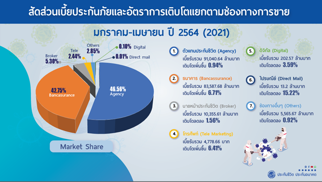 ซึ่งช่องทางตัวแทนประกันชีวิตยังคงเป็นช่องทางหลัก ด้วยเบี้ยประกันภัยรับรวม 91,040.64 ล้านบาท เติบโตเพิ่มขึ้นร้อยละ 0.94 มีสัดส่วนร้อยละ 46.56 รองลงมาเป็นการขายผ่านธนาคาร เบี้ยประกันภัยรับรวม 83,587.68 ล้านบาท เติบโตขึ้นร้อยละ 6.71 มีสัดส่วนร้อยละ 42.75 ตามด้วยช่องทางนายหน้าประกันชีวิต เบี้ยประกันภัยรับรวม 10,355.61 ล้านบาท เติบโตลดลงร้อยละ 1.56 มีสัดส่วนร้อยละ 5.30 ช่องทางอื่นๆเบี้ยประกันภัยรับรวม 5,565.67 ล้านบาท เติบโตลดลงร้อยละ 0.92 มีสัดส่วนร้อยละ 2.85 ช่องทางโทรศัพท์เบี้ยประกันภัยรับรวม 4,778.66 ล้านบาท เติบโตเพิ่มขึ้นร้อยละ 6.41 มีสัดส่วนร้อยละ 2.44 ช่องทางดิจิทัลเบี้ยประกันภัยรับรวม 202.57 ล้านบาท เติบโตลดลงร้อยละ 3.59 มีสัดส่วนร้อยละ 0.10 และ ช่องทางไปรษณีย์ เบี้ยประกันภัยรับรวม 13.2 ล้านบาท เติบโตลดลงร้อยละ 15.22 มีสัดส่วนร้อยละ 0.01