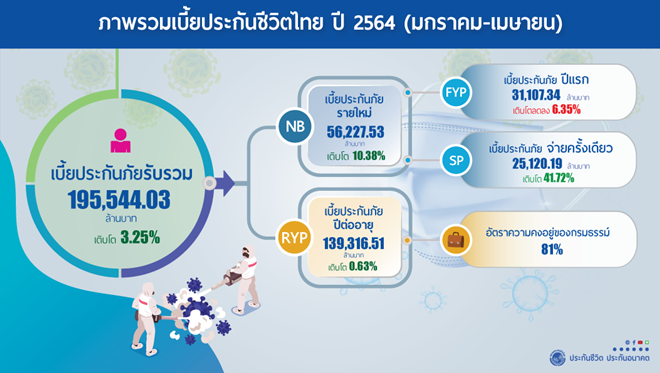 นายสาระ ล่ำซำ นายกสมาคมประกันชีวิตไทย เปิดเผยถึง ผลการดำเนินงานของธุรกิจประกันชีวิต 4 เดือนแรก ปี 2564 (มกราคม-เมษายน) มีเบี้ยประกันภัยรับรวม 195,544.03 ล้านบาท เติบโตเพิ่มขึ้นจากช่วงเวลาเดียวกันของปีก่อนร้อยละ 3.25 โดยแยกเป็นเบี้ยประกันภัยรับรายใหม่ 56,227.53 ล้านบาท เติบโตร้อยละ 10.38 ซึ่งประกอบด้วย เบี้ยประกันภัยรับปีแรก 31,107.34 ล้านบาท เติบโตลดลงร้อยละ 6.35 เบี้ยประกันภัยจ่ายครั้งเดียว 25,120.19 ล้านบาท เติบโตร้อยละ 41.72 และเบี้ยประกันภัยรับปีต่อไป 139,316.51 ล้านบาท เติบโตร้อยละ 0.63 อัตราความคงอยู่ของกรมธรรม์ร้อยละ 81