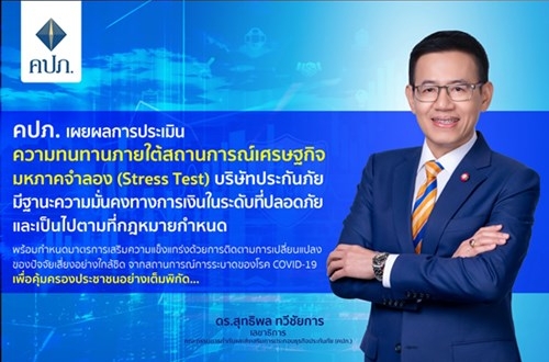 คปภ. เผยผลการประเมินความทนทานภายใต้สถานการณ์เศรษฐกิจมหภาคจำลอง   (Stress Test) บริษัทประกันภัย มีฐานะความมั่นคงทางการเงินในระดับที่ปลอดภัย และเป็นไปตามที่กฎหมายกำหนด พร้อมกำหนดมาตรการเสริมความแข็งแกร่ง ด้วยการติดตามการเปลี่ยนแปลงของปัจจัยเสี่ยงอย่างใกล้ชิด จากสถานการณ์การระบาดของโรค COVID-19 เพื่อคุ้มครองประชาชนอย่างเต็มพิกัด