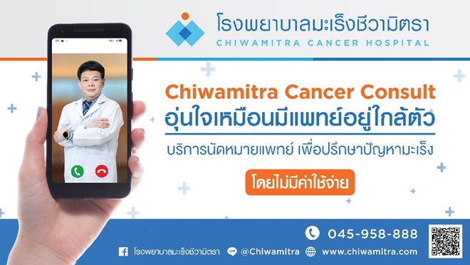 เพื่อเท่าทันต่อการรักษามะเร็ง โรงพยาบาลฯ ชูแนวคิดบริการออนไลน์"CHIWAMITRA Cancer Consult" บริการนัดหมายแพทย์ ทุกช่องทางผ่านไลน์ เฟสบุ๊กเว็บไซต์ หรือโทรศัพท์ 045-958-888 โดยไม่เสียค่าใช้จ่าย เพื่อปรึกษาทุกปัญหามะเร็ง ให้ผู้ป่วยมะเร็ง และญาติสามารถเข้าถึงช่องทางปรึกษาโรคมะเร็ง เผยโรงพยาบาลมะเร็งชีวามิตราพร้อมดูแลผู้ป่วยโรคมะเร็งทุกสถานการณ์ รับรักษาเฉพาะผู้ป่วยโรคมะเร็ง ย้ายมารักษาโรคมะเร็งอย่างต่อเนื่อง ไม่ต้องรอคิว รักษามะเร็งปลอดภัย โดยทีมแพทย์เฉพาะทางมะเร็ง ภายใต้ความปลอดภัยมาตรฐานกรมควบคุมโรค