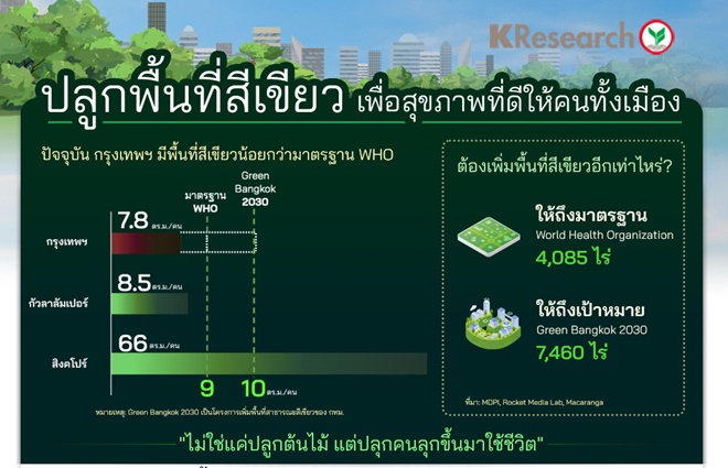 📍 กรุงเทพฯ มีพื้นที่สีเขียวเพียง 7.8 ตร.ม./คน ในขณะที่ WHO แนะนำให้มี 9 ตร.ม./คน ต้องเพิ่มพื้นที่อีกหลายพันไร่เพื่อให้เพียงพอ