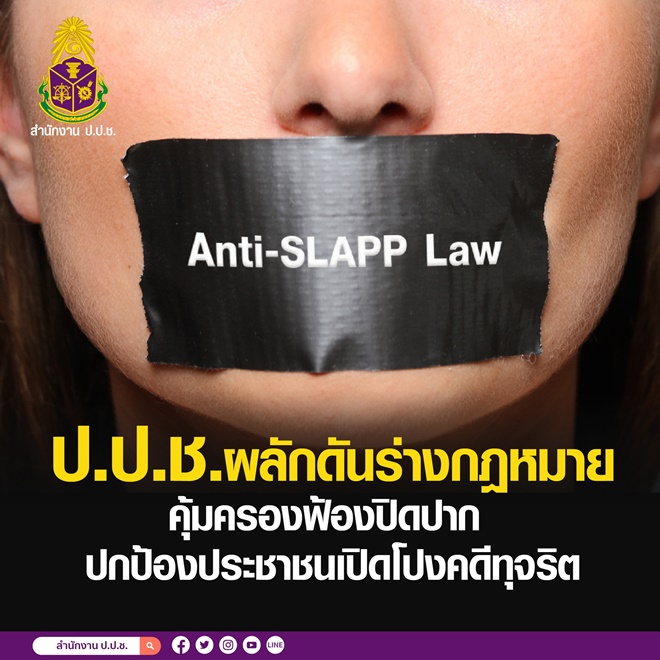 สำนักงำน ป.ป.ช. ผลักดันกฎหมำยคุ้มครองฟ้องปิดปำก เพื่อคุ้มครองประชำชนที่เปิดโปงแจ้งเบำะแสการทุจริต โดยมุ่งหวังประชำชนจะเกิดควำมเชื่อมั่นในกลไกทำงกฎหมำยที่ให้กำรปกป้อง คุ้มครอง และยังช่วยส่งเสริมให้ประชำชนเข้ามามีส่วนร่วมในการต่อต้ำนหรือชี้เบำะแสการทุจริตและประพฤติมิชอบมากยิ่งขึ้น