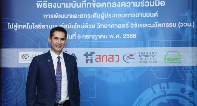 สำนักงานคณะกรรมการส่งเสริมวิทยาศาสตร์ วิจัยและนวัตกรรม (สกสว.) จับมือ หน่วยบริหารและจัดการทุนด้านการเพิ่มความสามารถในการแข่งขันของประเทศ (บพข.) สำนักงานนวัตกรรมแห่งชาติ (องค์การมหาชน) (สนช.) สถาบันยานยนต์ (สยย.) และ สมาคมยานยนต์ไฟฟ้าไทย (EVAT) ร่วมลงนามบันทึกข้อตกลงความร่วมมือการพัฒนาและยกระดับผู้ประกอบการยานยนต์ไปสู่เทคโนโลยียานยนต์สมัยใหม่ด้วยวิทยาศาสตร์ วิจัยและนวัตกรรม (ววน.) เพื่อให้เกิดกิจกรรมในการขับเคลื่อนการยกระดับผู้ประกอบการยานยนต์ให้สามารถเปลี่ยนผ่านไปสู่อุตสาหกรรมยานยนต์สมัยใหม่ และสร้างโอกาสในการพัฒนาศักยภาพการผลิต ตลอดจนผลักดันให้ผู้ประกอบการสามารถพัฒนาผลิตภัณฑ์ที่แข่งขันได้อย่างยั่งยืน โดยมี รองศาสตราจารย์ ดร.พงศ์พันธ์ แก้วตาทิพย์ รองผู้อำนวยการ สกสว. รองศาสตราจารย์ ดร.สิรี ชัยเสรี ผู้อำนวยการ บพข. คุณวิเชียร สุขสร้อย รองผู้อำนวยการด้านเศรษฐกิจและสังคม สนช. ดร.เกรียงศักดิ์ วงศ์พร้อมรัตน์ ผู้อำนวยการ สยย. ผู้ช่วยศาสตราจารย์ ดร.มัณฑนา รังสิโยภาส เลขาธิการ EVAT ผู้บริหารบริษัทยานยนต์และชิ้นส่วนยานยนต์ แขกผู้มีเกียรติ และสื่อมวลชน เข้าร่วมงาน ณ โรงแรมแลงคาสเตอร์ กรุงเทพฯ