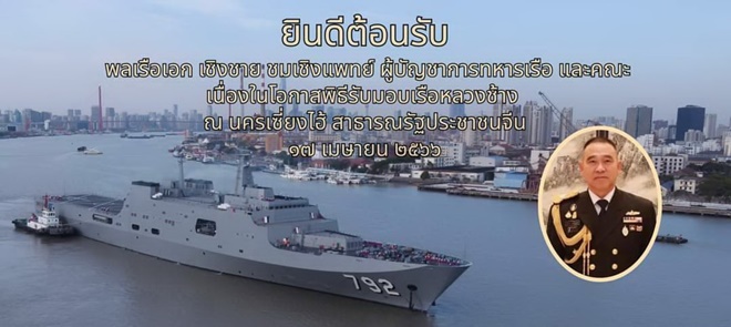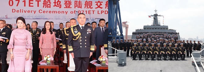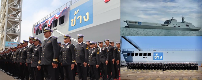พลเรือเอก เชิงชาย ชมเชิงแพทย์ ผู้บัญชาการทหารเรือ พร้อมด้วย นางจตุพร ชมเชิงแพทย์ นายกสมาคมภริยาทหารเรือ และคณะเป็นประธานในพิธีรับมอบ เรือหลวงช้าง เรือยกพลขึ้นบก ลำใหม่ของกองทัพเรือ ณ อู่ต่อเรือหูตงจงหัว สาธารณรัฐประชาชนจีน