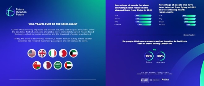 มีสัญญาณที่น่าเป็นห่วงเกี่ยวกับการฟื้นตัวของอุตสาหกรรมการบิน เนื่องจากชาวอเมริกันหนึ่งในสาม (32%), อิตาลี 40%, อังกฤษ 40% และเกือบครึ่ง (46%) ในอ่าวอาหรับ ระบุว่าความสับสนเกี่ยวกับข้อกำหนดด้านสุขภาพทำให้พวกเขาจะยังไม่เดินทางด้วยเครื่องบินในปี 2565 นี้