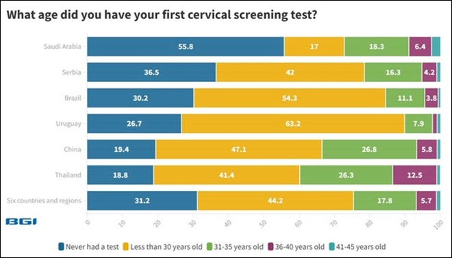 ผลการศึกษาของมหาวิทยาลัยมหิดลเผยให้เห็นว่า มีผู้หญิงไทยเพียง 28.5% ที่ได้รับการวินิจฉัยว่าเป็นมะเร็งปากมดลูกระยะที่ 1 ซึ่งเป็นระยะที่มีอัตราการรอดชีวิตสูงสุด ดังนั้น เพื่อกระตุ้นให้เกิดการต่อสู้กับมะเร็งปากมดลูก บริษัท บีจีไอ จีโนมิกส์ (BGI Genomics) ได้เผยแพร่รายงานความตระหนักรู้มะเร็งปากมดลูกในประเทศไทย (State of Cervical Cancer Awareness Report in Thailand) รายงานฉบับนี้ได้ประเมินระดับความรู้ ทัศนคติ และแนวปฏิบัติในการตรวจคัดกรองมะเร็งปากมดลูกและการฉีดวัคซีน HPV เพื่อแสดงให้เห็นถึงอุปสรรคและโอกาสที่เกี่ยวข้อง โดยทำการสำรวจผู้หญิง 1,878 คน จาก 6 ประเทศและภูมิภาค ได้แก่ บราซิล จีนแผ่นดินใหญ่ ซาอุดีอาระเบีย เซอร์เบีย ไทย และอุรุกวัย